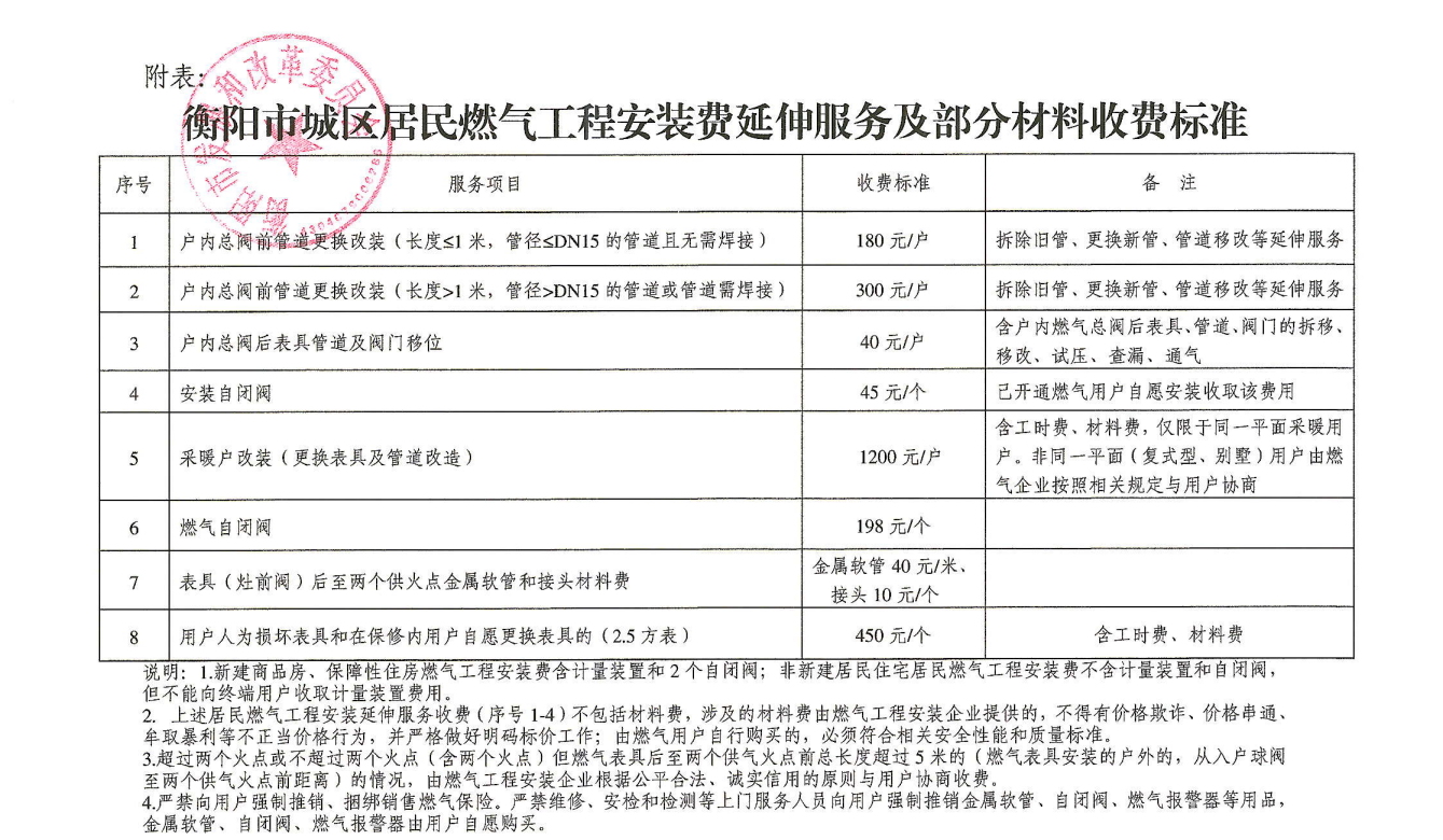 根據(jù)衡陽市發(fā)展和改革委員會(huì)《關(guān)于規(guī)范市中心城區(qū)燃?xì)夤こ贪惭b收費(fèi)有關(guān)事項(xiàng)的通知》(衡發(fā)改價(jià)商〔2024〕2號(hào))文件規(guī)定: