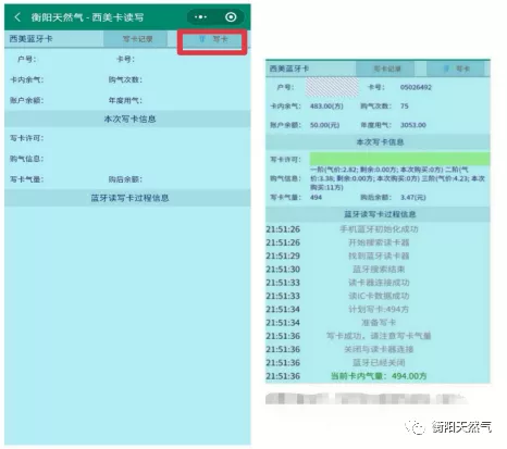 5、充值成功后將燃?xì)饪ㄐ酒虏迦胨{(lán)牙讀卡器中,點(diǎn)擊寫卡可將儲(chǔ)存余額轉(zhuǎn)充成氣量。(如顯示寫卡不成功,可再次點(diǎn)擊寫卡重試,轉(zhuǎn)氣時(shí)不能關(guān)閉藍(lán)牙。)